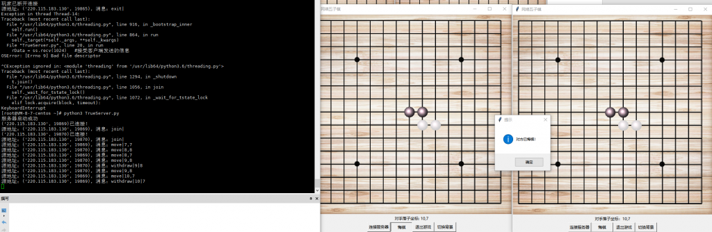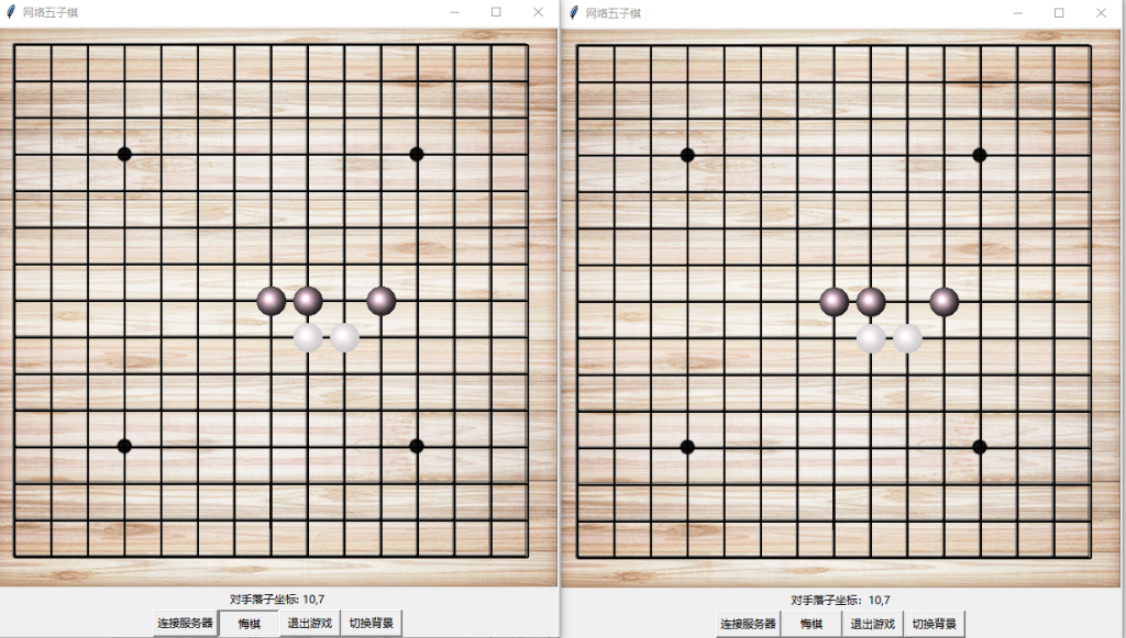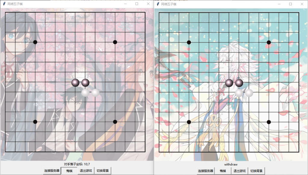 当收到的是悔棋报文时会删除刚刚生成的对方棋子,并将回合转为对方回合,同时将对方悔棋坐标对应的map值设为‘ ’。