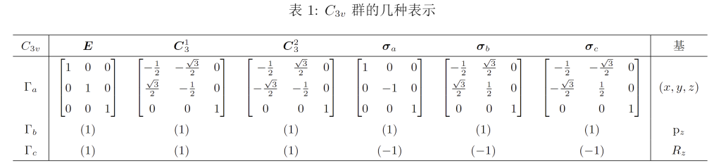 这也是为什么在点群的表示,或者特征标表中,我们总能看到一维表示的矩阵只出现了1和-1。例如表1,其中的\(\Gamma_b\)和\(\Gamma_c\)就是一维的基的表示,里面的矩阵均只是1或者-1.
