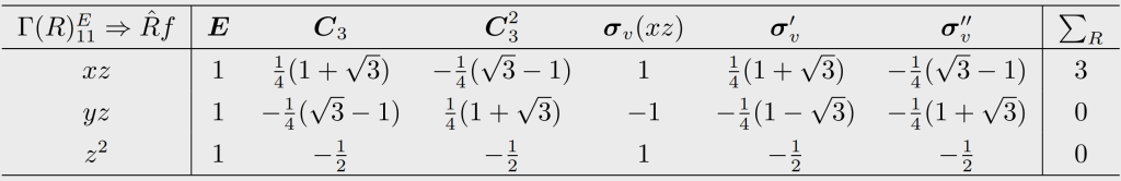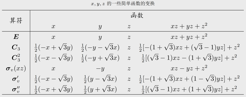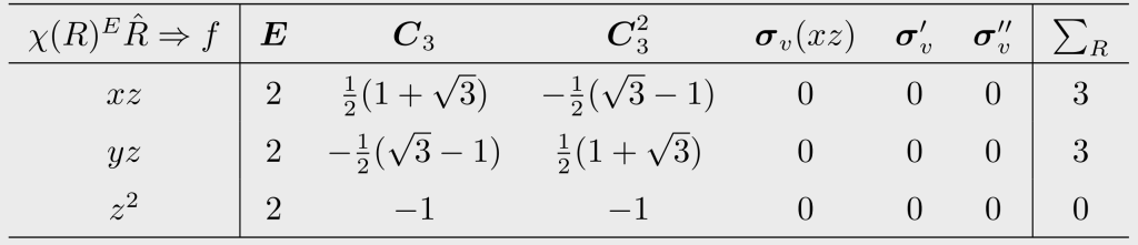 类似前述,把各系数\(xz,yz,z^2\)乘上相应的特征标,并做好整理,如下