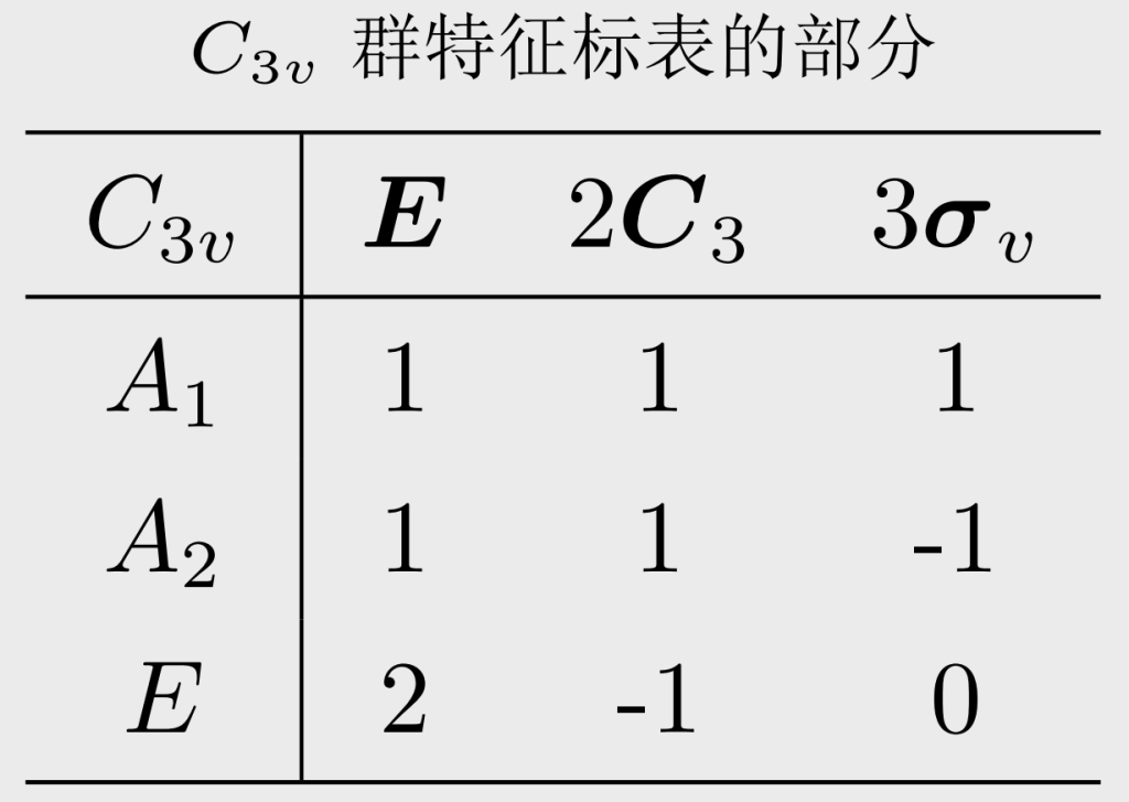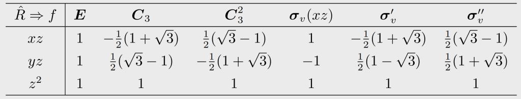 利用这个投影算符\(\hat{P}^j\),我们只需要一个特征标表,就能够轻松地获得正确的SALCs了。