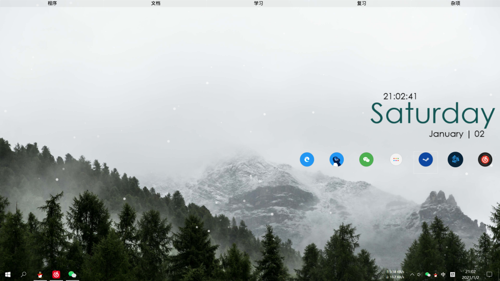我找了个能模拟下雪效果的动态壁纸,把这个森林的图设置成自定义壁纸。舒服了。